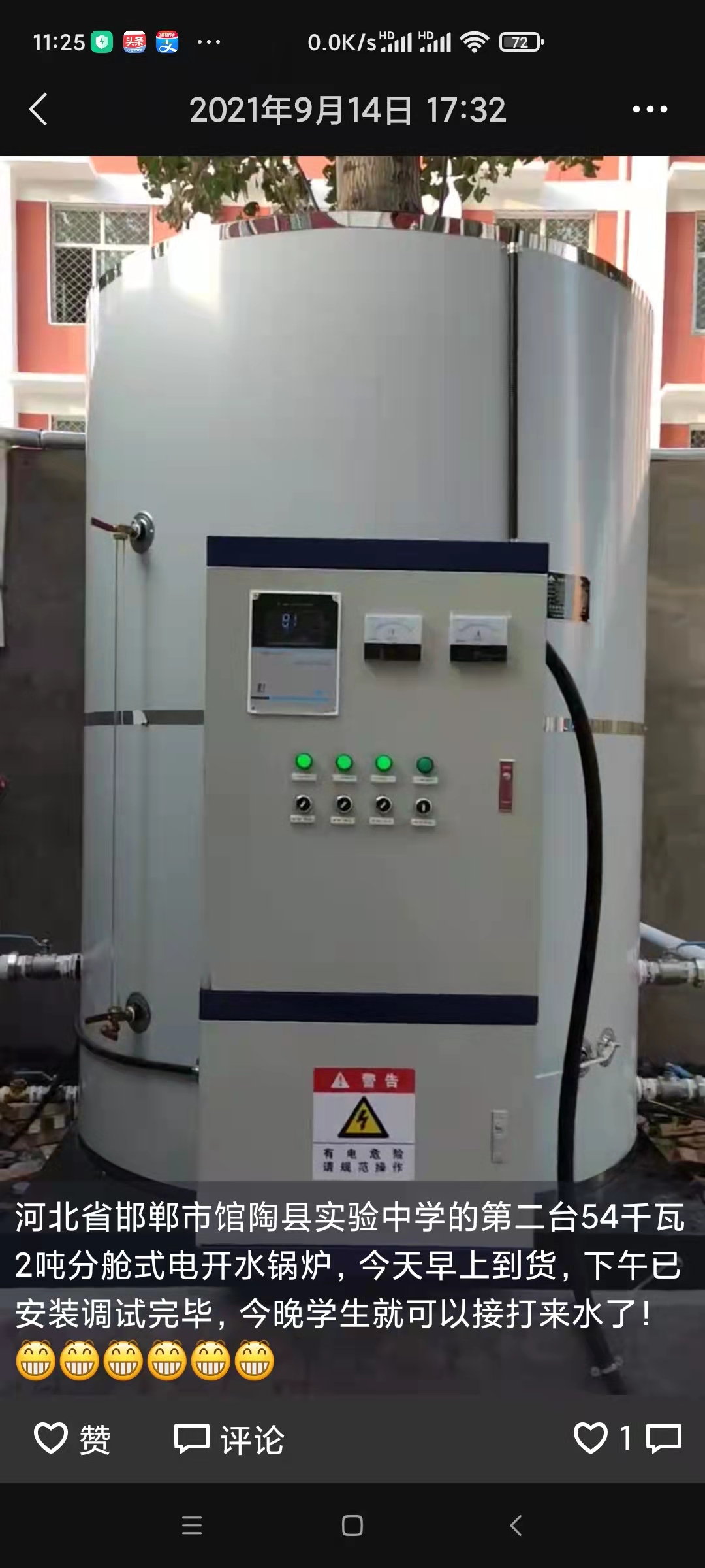 館陶縣實驗中學(xué)就是原來的館陶縣第二中學(xué),位于邯鄲市館陶縣文衛(wèi)街089號,2021年8月份訂購兩臺54千瓦兩噸電開水爐,分別于2021年8月29日和9月14日安裝調(diào)試完畢,交付校方使用!
